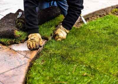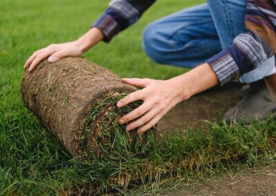Professional turfing installations including proper ground preparation, levelling, and careful turf laying to create healthy, even lawns with strong root growth and long-lasting garden appeal.